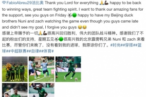 很高兴我的北京霹雳鸭兄弟 Nuni(奥莫特)和Zach(纳托尔)来看比赛,尽管你们来晚了,没有看到我的进球,我原谅你们了。